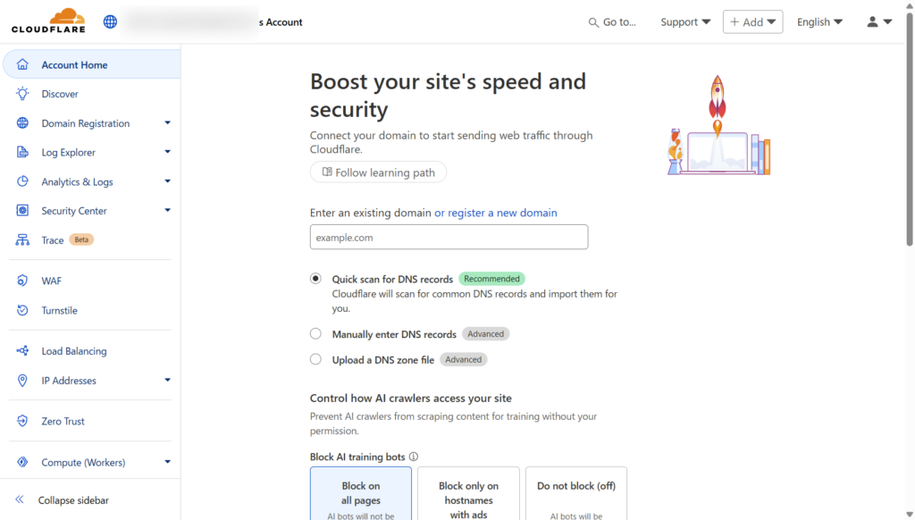 アカウント作成後に、以下のような「Cloudflare」のダッシュボートが表示されます。