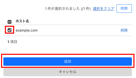 2.ホスト名が画面下部に表示されるので、選択して、再度「追加」ボタンをクリック。