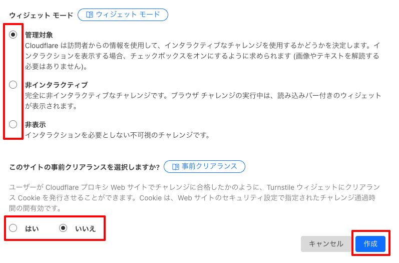 まず 、Turnstile のウィジェットモードを「管理対象(Managed)」に設定し、サイト上で表示・動作を確認します。