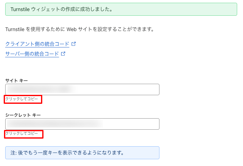 APIキーの設定:成功!TurnstileはこれらのAPIキーで正しく動作します。
