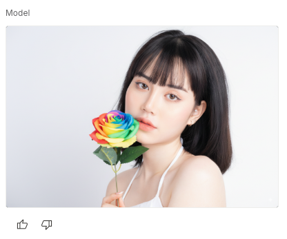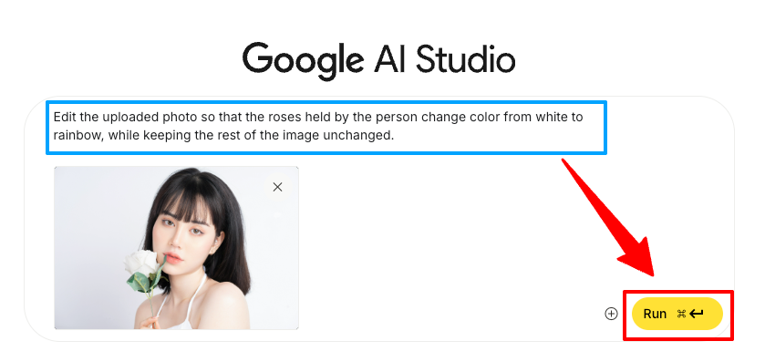 Edit the uploaded photo so that the roses held by the person change color from white to rainbow, while keeping the rest of the image unchanged.プロンプトを入力したら、右側Runボタンをクリックで画像生成がはじまります。