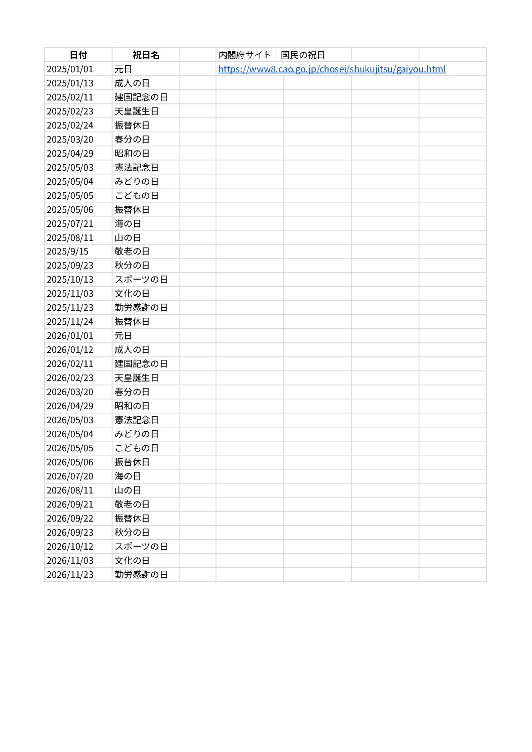 祝日の設定は、内閣府公式サイト「国民の祝日」を参照しています。